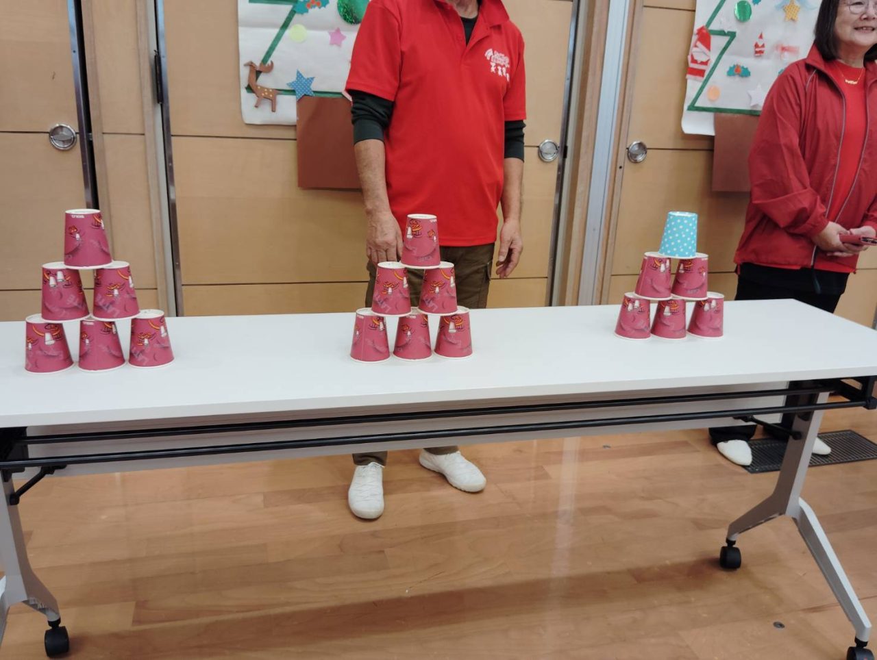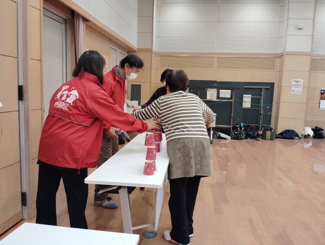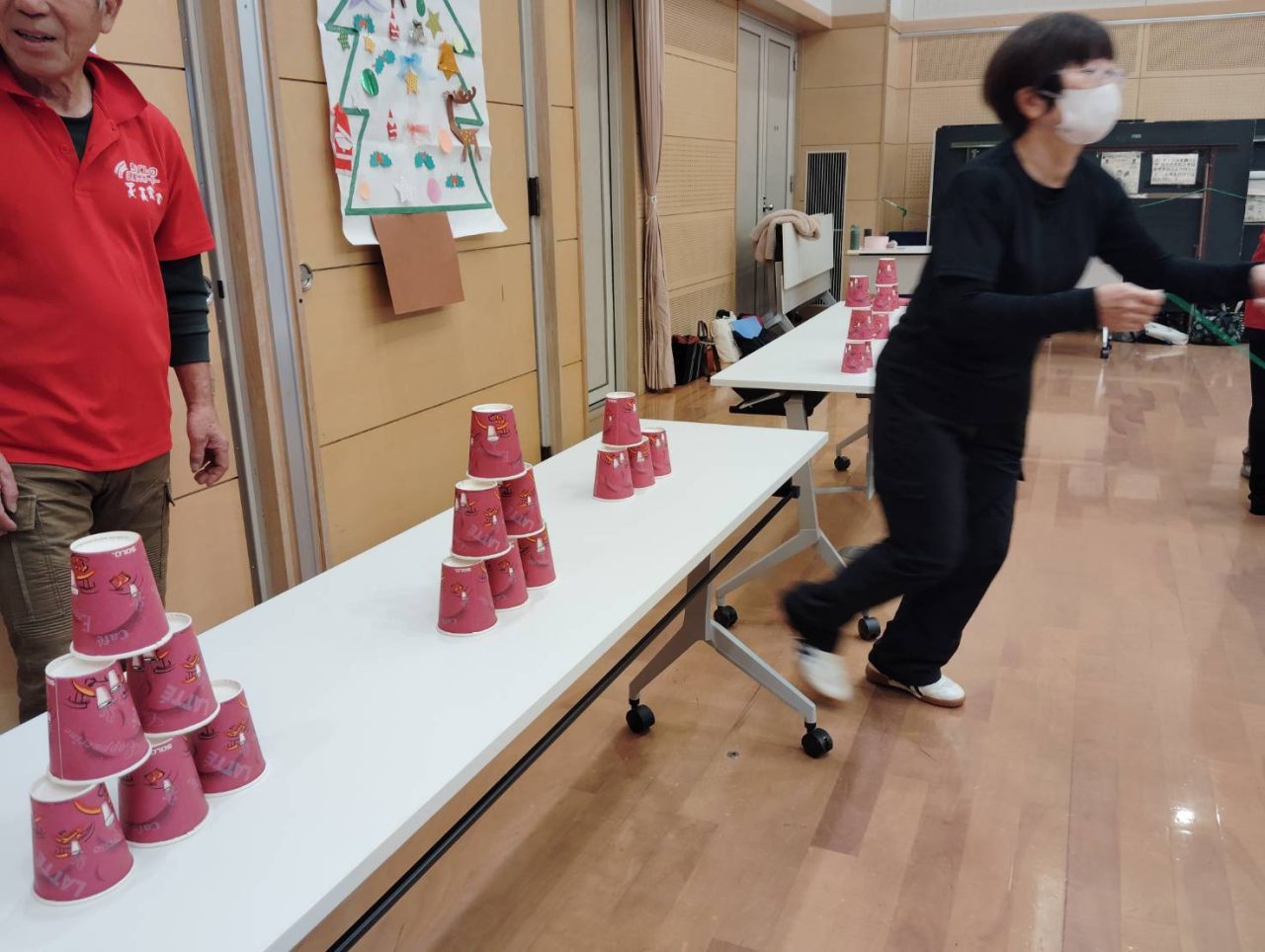 - 手を使わずに運んで積み上げるルール。途中で落としたり倒れたりしても、皆さん器用に輪ゴムで対応。失敗はありませんでした。
