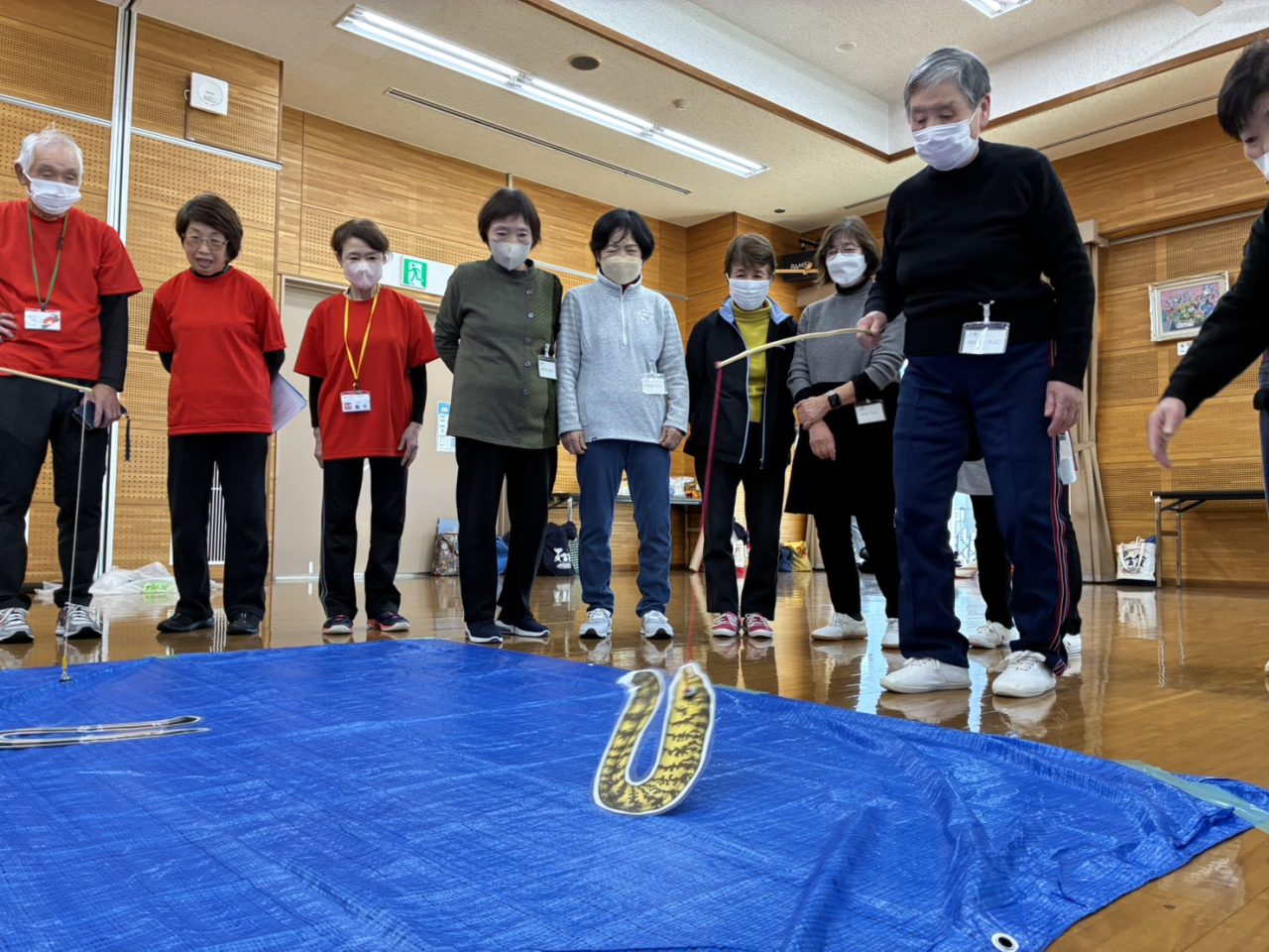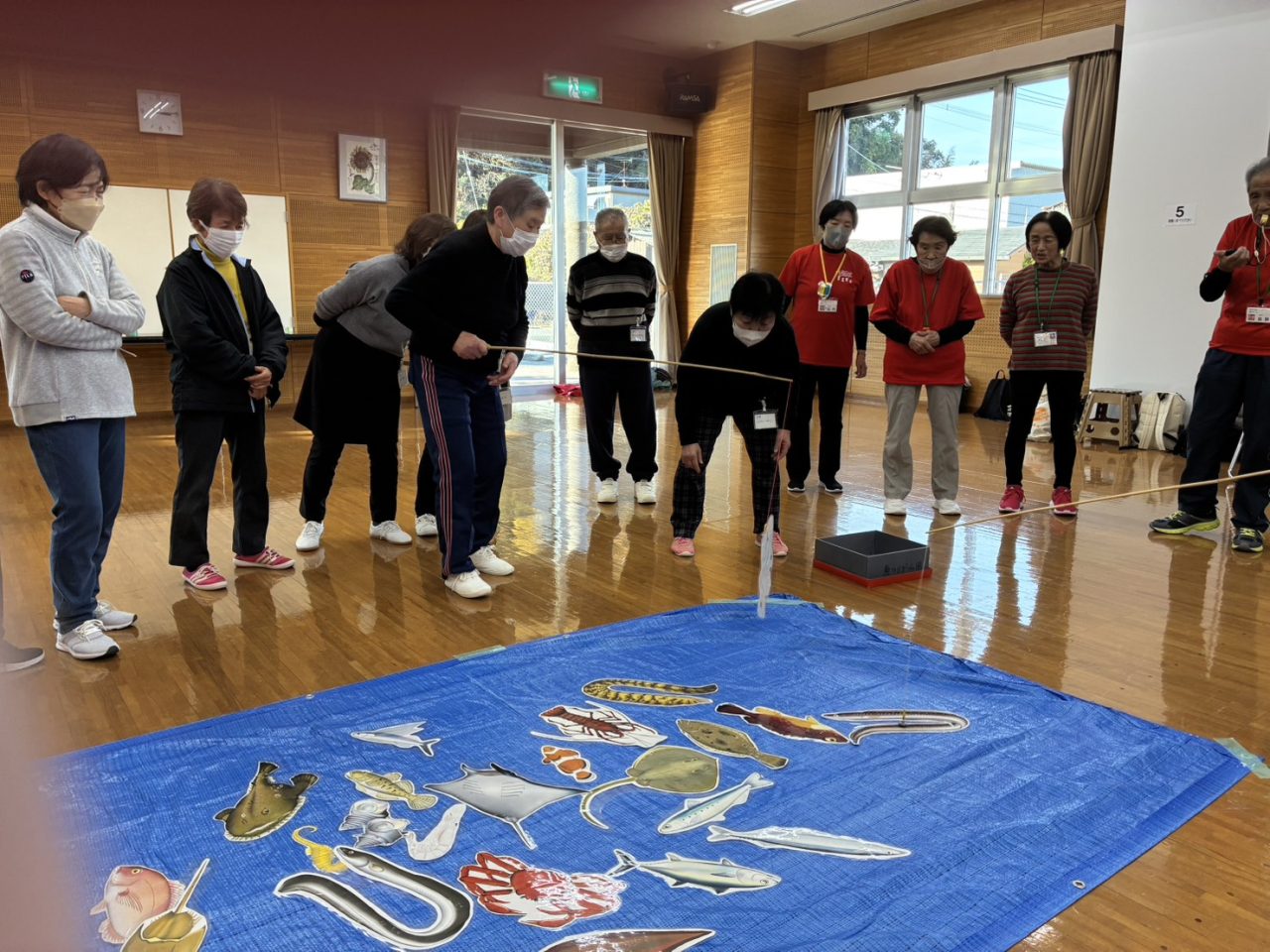 • ブルーシートに並べられた紙の魚を釣り竿(バトン)で釣る(ただし、一人当たり制限時間は20秒とする)。皆さん夢中になって楽しんでいました。